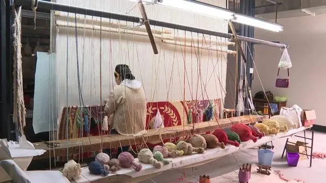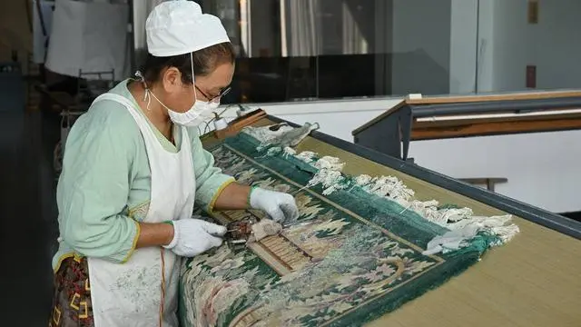 走进博物馆,可以看到一个个木质支架上,蚕丝紧紧绷成白色毯布,数种彩色丝线次第排列,工人熟练地将一根根丝线缠绕打结,双手翻飞间,繁密精致的图案跃然“毯”上。