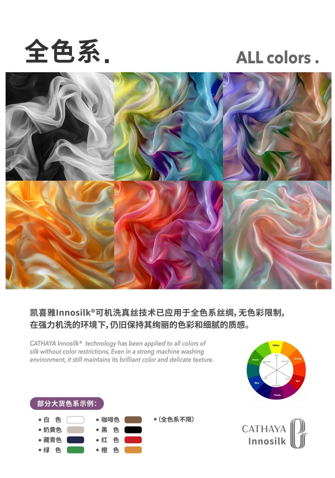 凯喜雅Innosilk®可机洗真丝技术已应用于全色系丝绸,无色彩限制,且固色能力强,在机洗的环境下,仍旧保持其绚丽的色彩和细腻的质感。已大货颜色包含白色、奶黄色、橙色、红色、绿色、藏青色、咖啡色、黑色等。全色系不限。
