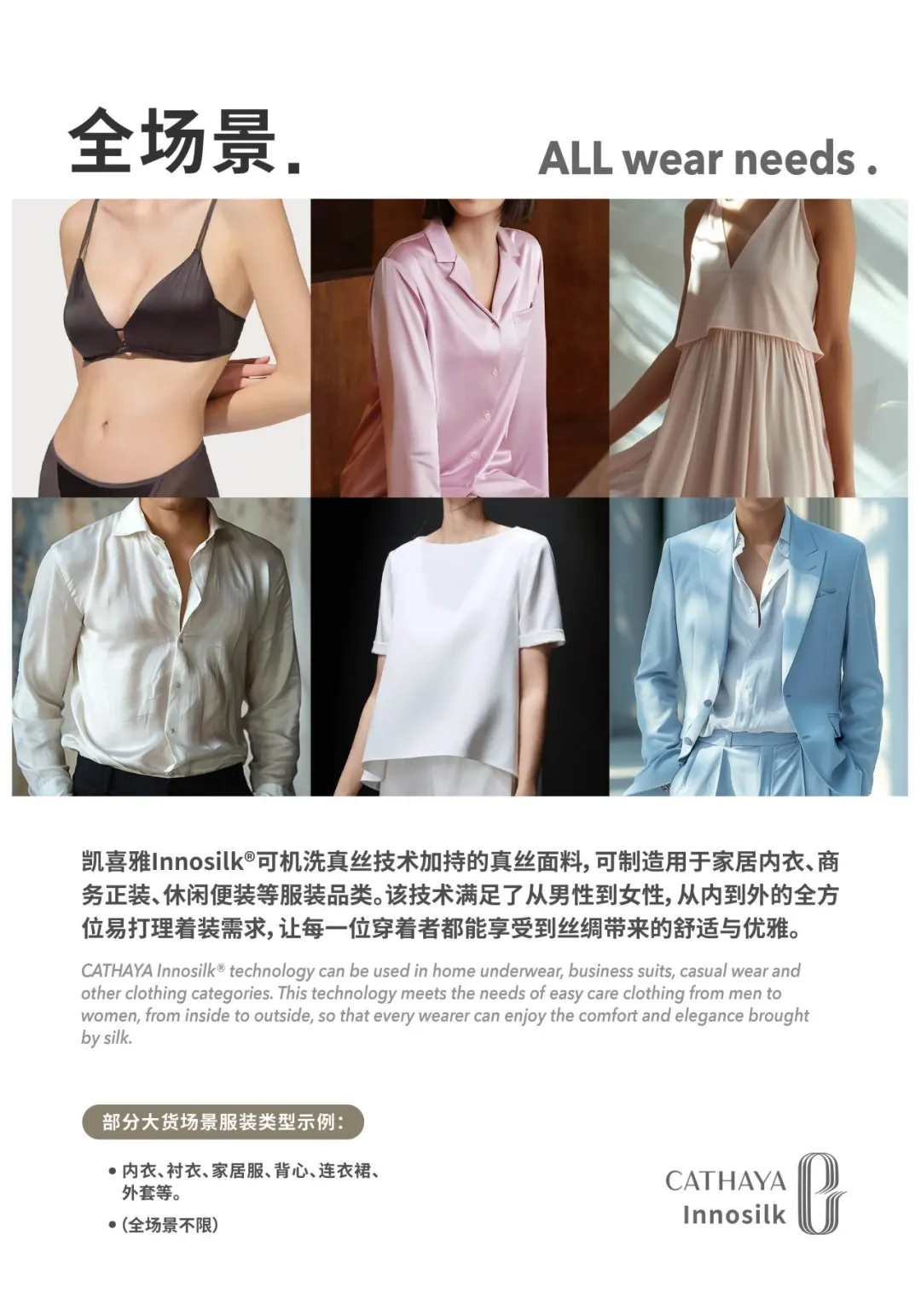 凯喜雅Innosilk®可机洗真丝技术拓宽了真丝面料的家居、社交、休闲等使用场景,给品牌方和设计师带去更多选择可能性。传统真丝面料因其不易打理的特性,适用场景很局限,而经过Innosilk®可机洗技术加持后的真丝面料耐洗耐磨,可用于制造商务正装、休闲便装、家居内衣等服装品类,满足了从男性到女性,从内到外的全方位易打理着装需求,让每一位穿着者都能享受到丝绸带来的舒适与优雅。已大货服装品类包含内衣、衬衣、家居服、连衣裙、外套等。全场景不限。