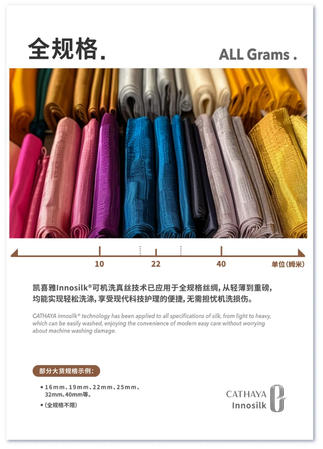 凯喜雅Innosilk®可机洗真丝技术已应用于全规格丝绸,从轻薄到重磅,均能实现轻松洗涤,享受现代科技护理的便捷,无需担忧机洗损伤。已大货规格包含16mm、19mm、22mm、25mm、32mm、40mm等。全规格不限。