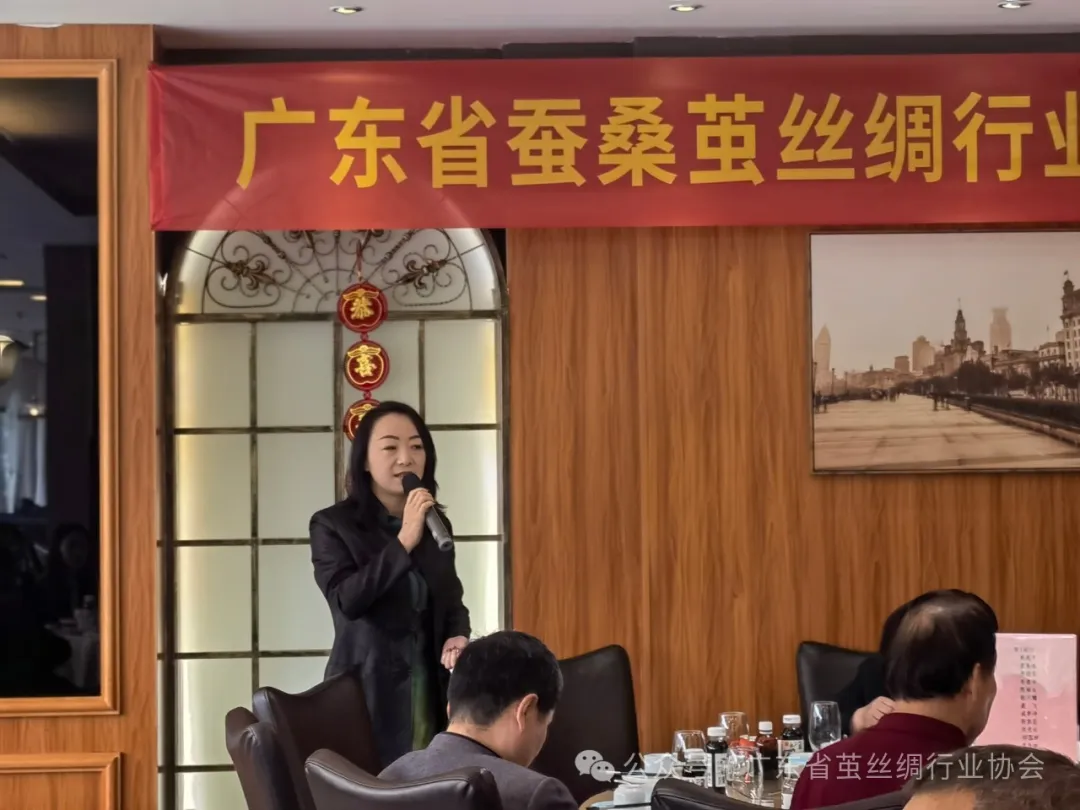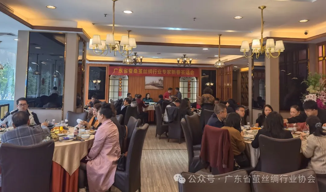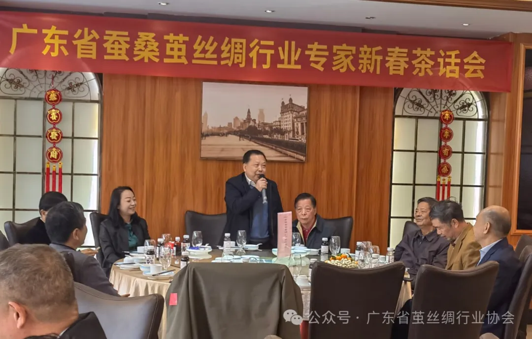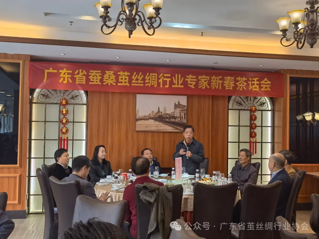 2月13日上午,广东省茧丝绸行业协会和广东省蚕学会在东方丝绸大酒店共同举办2025年广东省蚕桑茧丝绸行业专家新春茶话会,省内蚕桑茧丝绸专家和企业家们共约60人欢聚一堂,共度佳节,共话丝绸事,共聚丝绸情。中国丝绸协会副会长,广东省丝绸纺织集团有限公司党委书记、董事长、总经理,广东省茧丝绸行业协会会长李晓莹,广东省人大农村农业委员会副主任委员、广东省农业科学院原党委书记廖森泰,广东省人民政府原参事、广东省丝绸纺织集团有限公司原党委书记、董事长蔡高声在新春茶话会上分别致辞,感谢专家和企业家们过往对广东蚕桑茧事业做出巨大贡献,勉励丝绸人继续勇于前行,团结协作,共同努力,抓牢蚕桑茧发展的机遇,跟上时代的步伐,特别是广东非遗香云纱事业,将香云纱做大做强。广东茧丝绸发展需要更多有担当,有社会责任感的企业家,希望更多的优秀人才加入壮大广东丝绸行业的队伍,为各自家乡做出更大贡献。