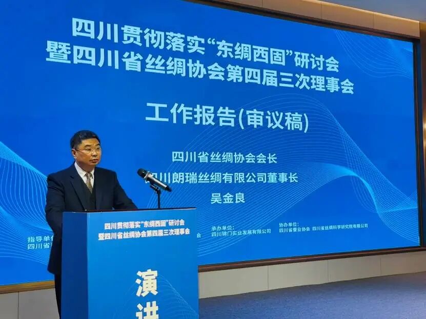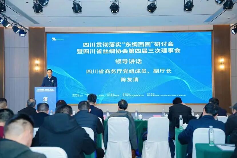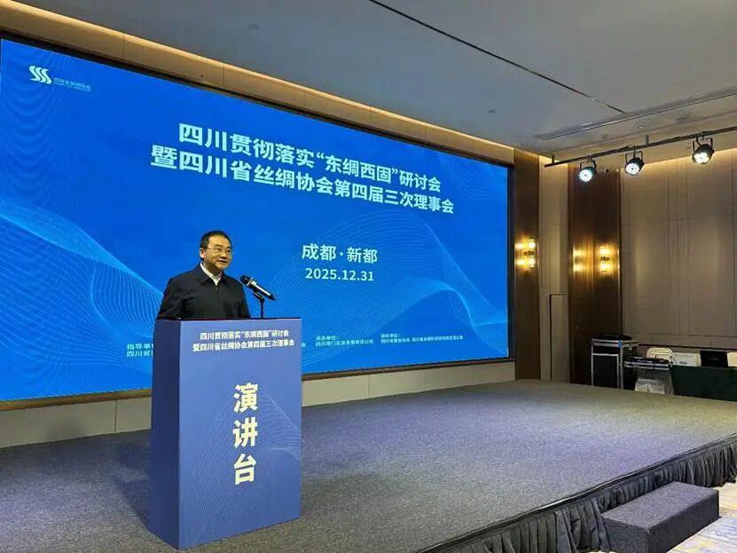 2025年12月31日,四川贯彻落实“东绸西固”研讨会暨四川省丝绸协会第四届三次理事会在成都新都区成功召开。会议由四川省商务厅指导,成都市新都区人民政府支持,四川省丝绸协会主办,四川省锦门实业发展有限公司承办,四川省蚕业协会、四川省丝绸科学研究院有限公司协办。来自省经济和信息化厅、省蚕业管理总站、市州蚕业产业发展中心、蚕种场、行业高校院所、质量检测、海关外贸、文化旅游等部门及省内80余家会员单位共200余人齐聚一堂,研讨落实商务部“东绸西固”工作,审议理事会工作报告及提案,总结交流行业发展情况,研究部署明年工作重点,共商四川丝绸产业在新形势下的发展路径。省商务厅党组成员副厅长陈友清出席会议并讲话,四川省经济和信息化厅轻工纺织处副处长、二级调研员刘伟、成都市新都区人民政府党组成员、副区长胡蓝分别为大会致辞。中国丝绸协会副会长、四川省丝绸协会会长、四川朗瑞丝绸有限公司董事长吴金良代表本届理事会向大会作2025年工作报告,中国丝绸协会副会长、四川省丝绸协会副会长、四川省丝绸科学研究院党委书记、董事长程明作提案报告。四川省蚕业管理总站站长王彦红,协会副会长单位、四川省农业科学院蚕业研究所党委委员、副所长黄盖群,中国丝绸协会副会长、四川省丝绸协会副会长、宁南县南丝路集团党委书记、董事长林平,中国丝绸协会副会长、四川省丝绸协会副会长、四川安泰茧丝绸集团董事长唐定云,四川省丝绸科学研究院党委委员、董事、副总经理郑丹,四川南充六合(集团)有限责任公司总经理明刚分别作交流发言。会议由四川省丝绸协会秘书长、四川省丝绸科学研究院党委副书记唐仕成主持。