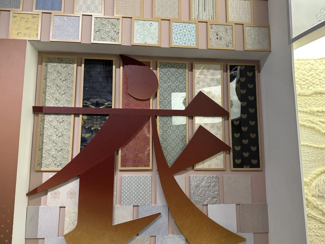 创新性面料组:在恪守宋锦传统工艺精髓的基础上,通过系统性材料研发与结构创新,打破传统桑蚕丝的应用边界,构建起兼具东方美学语汇与当代功能属性的多元化面料体系。展区以“宋”“锦”二字为视觉核心,笔画间分别包覆不同创新面料,直观呈现宋锦在质感、光泽、肌理等方面的科技突破,展现盛泽企业在材料创新领域的探索成果。