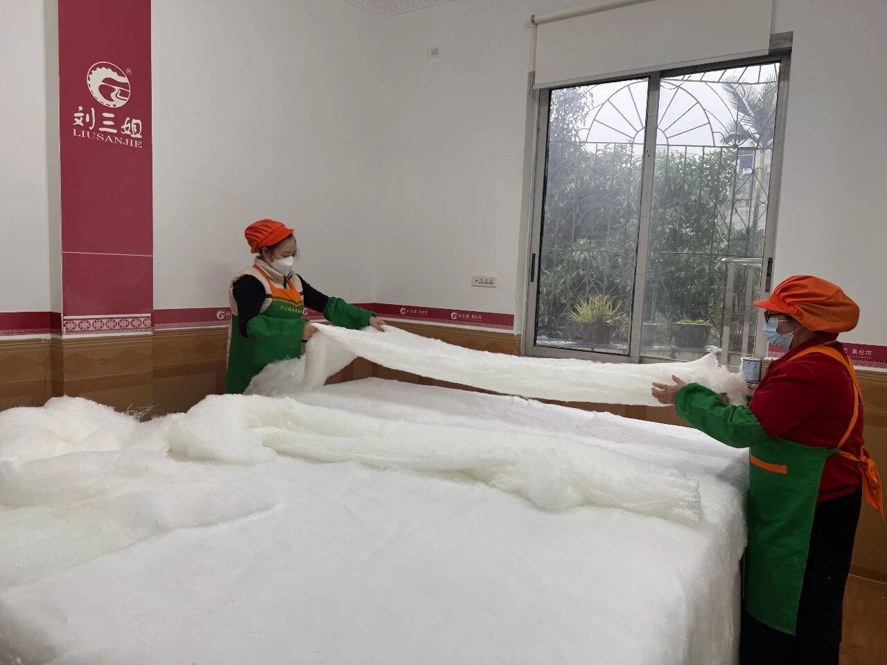 近日,在广西嘉联丝绸股份有限公司、广西刘三姐家居文化有限公司的生产车间里,蚕丝被制作工作正有条不紊地推进。经过多道预处理的桑蚕长丝莹白柔软,工人们分工协作,完成手工拉制、定点缝制、压边缝合等工序,再经严格质检后装入芯套,一床床兼具品质与温度的蚕丝被便新鲜出炉。“‘手工拉制’这一步,全凭手上的功夫。这蚕丝必须要一层层拉得很蓬松,这样盖在身上才暖和,这就是咱们宜州蚕丝被‘贴身保暖’的秘诀。”刘三姐家居文化有限公司工人杨女士介绍道。