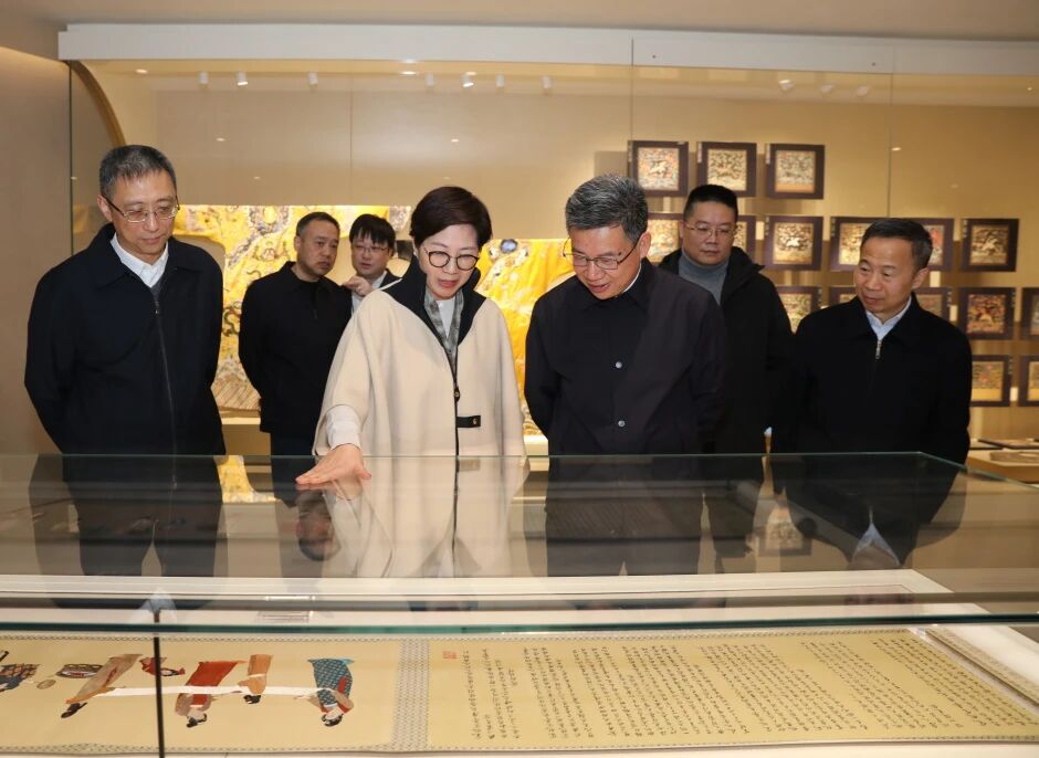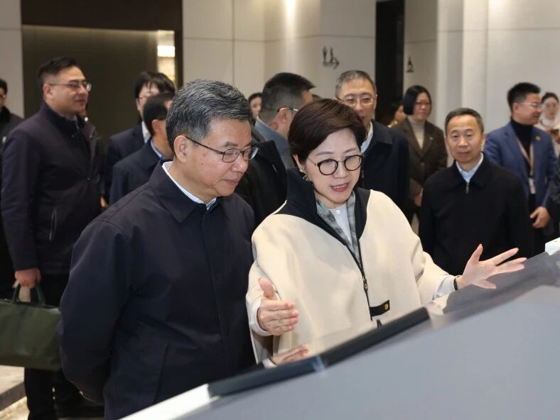 在万事利科创中心,暨军民重点考察了企业以科技创新赋能传统丝绸产业的最新成果,详细了解AI花型设计大模型、无水印花一体机等丝绸产业新质生产力的发展情况。