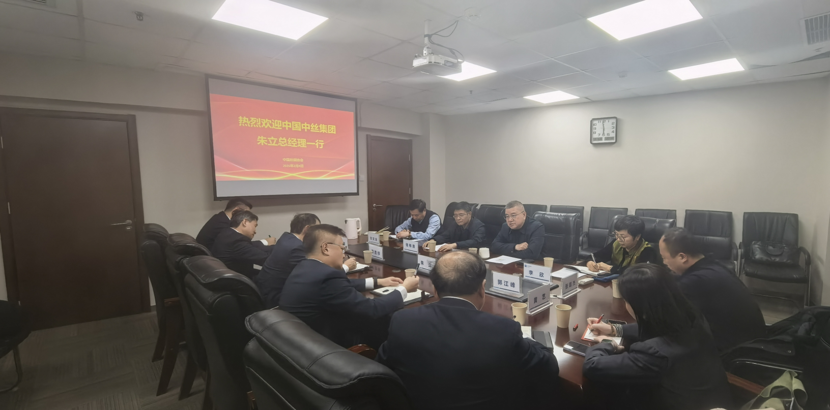 2月4日下午,中国丝绸协会会长唐琳在京会见来访的中国中丝集团有限公司党委副书记、总经理朱立一行并座谈交流。协会党支部书记、监事长钱有清,副会长李欣、副会长兼秘书长刘文全,中国中丝集团有限公司副总经理周胜标、总经理助理郭江峰及相关部门负责人参加座谈。