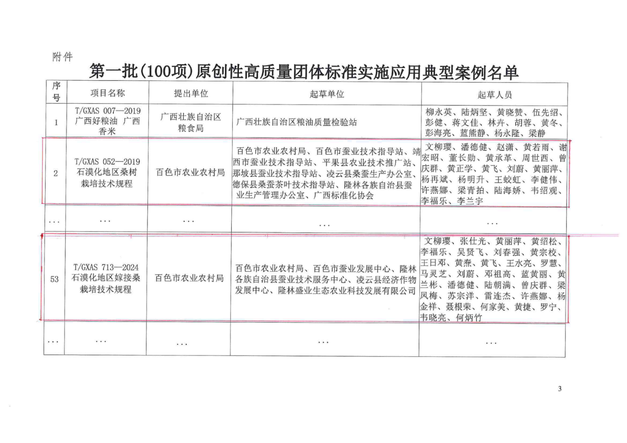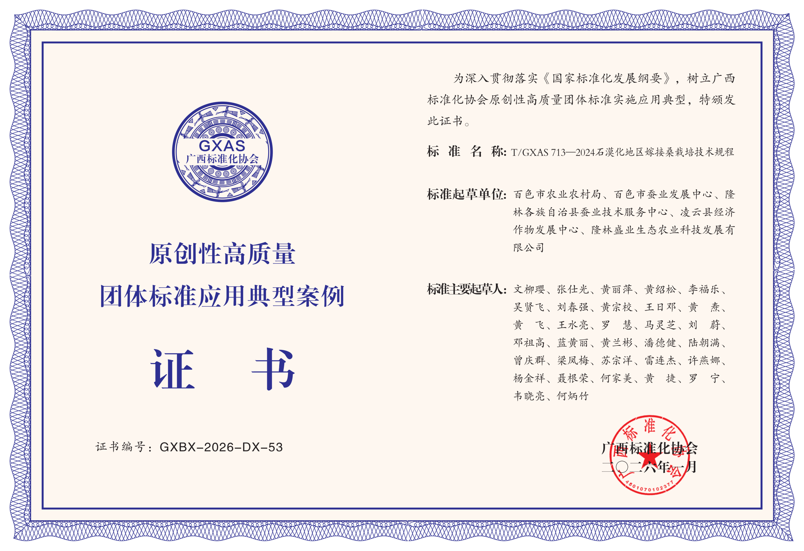 2026年初,广西标准化协会公布第一批(100项)原创性高质量团体标准实施应用典型案例名单,由百色市农业农村局提出,百色市蚕业发展中心(原百色市蚕业技术指导站)牵头,联合市内蚕桑技术服务部门及企业等共同制定的2项团体标准(T/GXAS 052-2019)《石漠化地区桑树栽培技术规程》和(T/GXAS 713-2024)《石漠化地区嫁接桑栽培技术规程》成功入选,分列第2和53项。