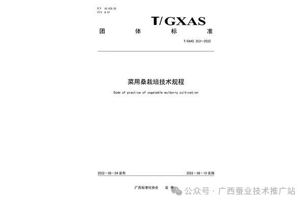 近日,广西壮族自治区标准化协会公布第一批标准实施应用典型案例,由广西蚕业技术推广站牵头编制的团体标准T/GXAS353—2022《菜用桑栽培技术规程》(以下简称《规程》)成功入选“原创性高质量团体标准实施应用典型案例”。