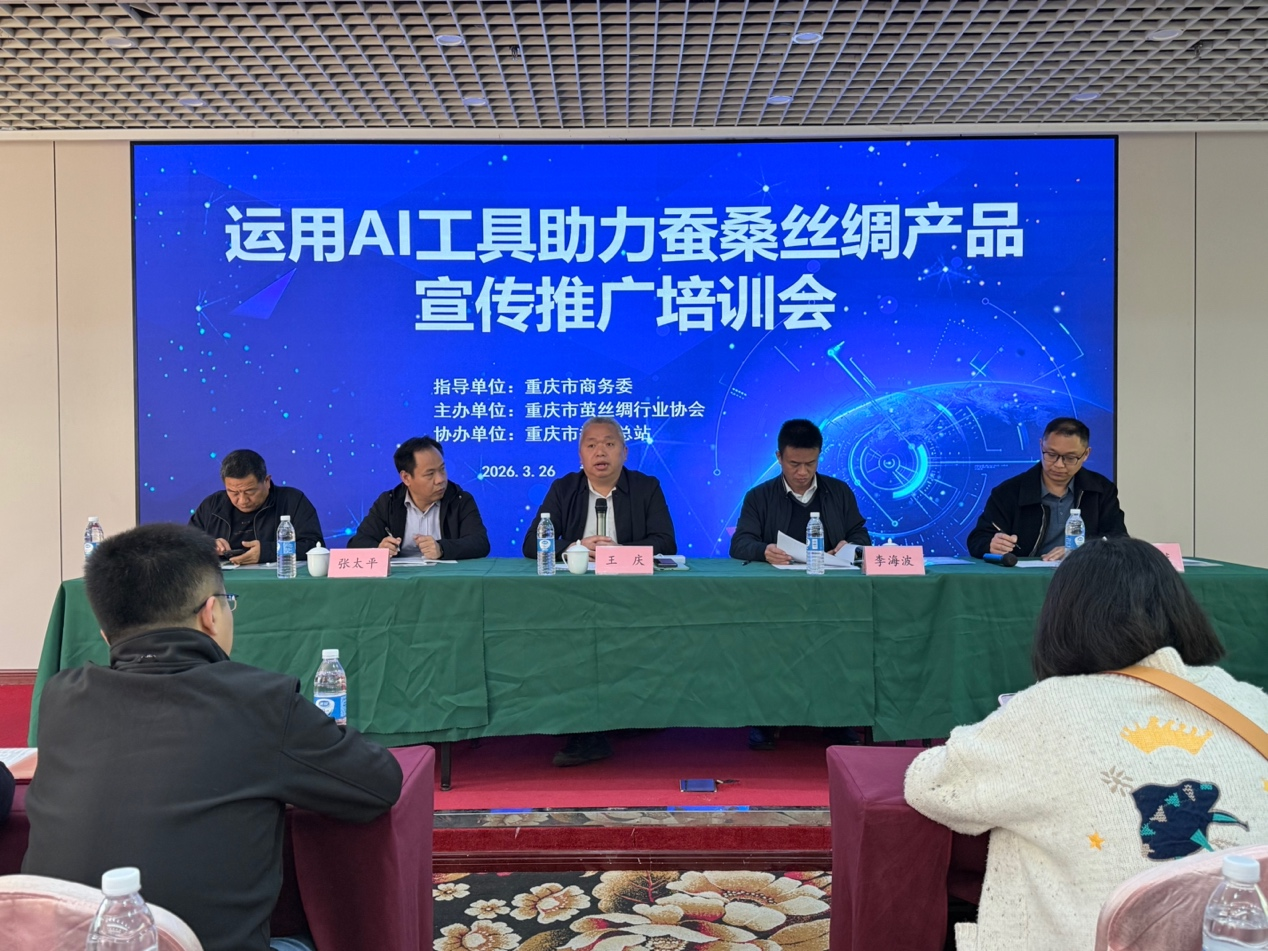 3月26日上午,由重庆市商务委员会指导、重庆市茧丝绸行业协会主办、重庆市蚕业总站协办的运用AI工具助力蚕桑丝绸产品宣传推广培训会在重庆竹林宾馆成功举行。重庆市商务委员会市场体系建设处一级调研员王庆,重庆市蚕业总站站长李海波、副站长张太平、余华献,重庆市茧丝绸行业协会秘书长钟兴权等领导出席会议。来自各区县的蚕桑茧丝绸行业主管部门负责人,以及蚕桑茧丝绸企业工作人员等60余人参加本次培训。本次培训会由重庆市茧丝绸行业协会秘书长钟兴权主持。