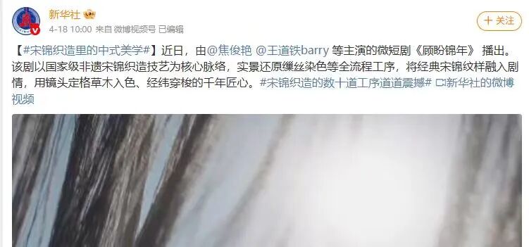 “我们通过微短剧的快节奏叙事,来讲述非遗的慢工细活,既打破了年轻人对非遗‘古老晦涩’的刻板印象,也让我们宋锦的地域文化标识,随着剧情的传播走进更多观众视野。”